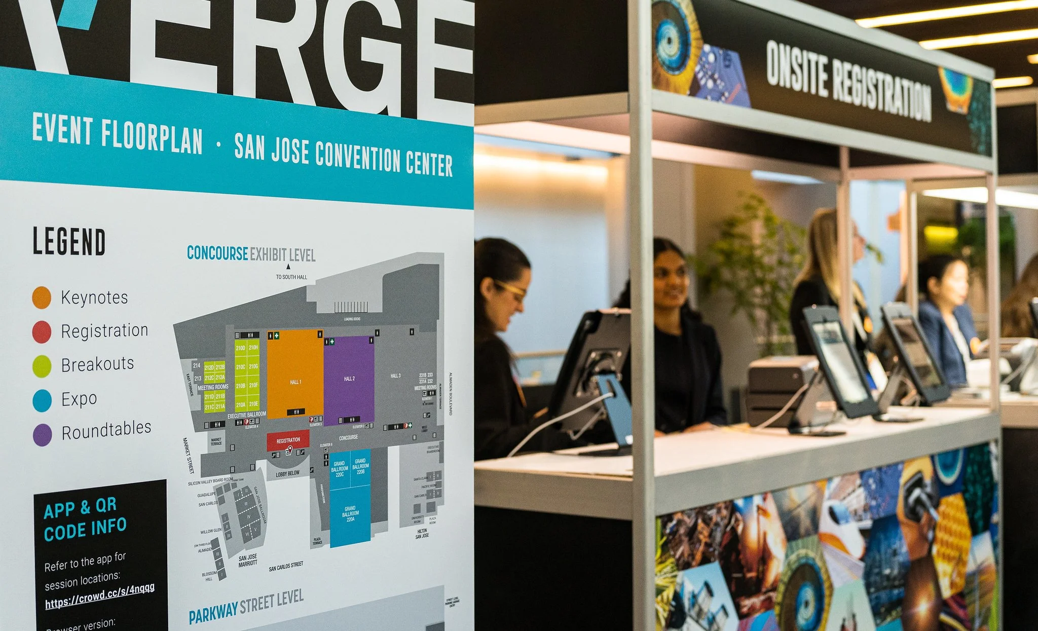 Badges featuring a QR code for quick access to the event app and wayfinding.